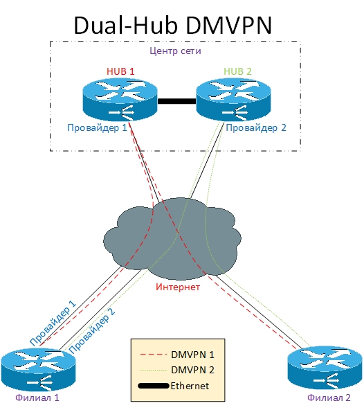 В качестве решения будеv использовать IPSec VPN на Cisco, ну а что бы трафик ходил между филиалами - воспользуемся технологией DMVPN. Таким образом у нас будет Центр (hub) и два Филиала (spoke) - обе эти группы будут настраиваться по своему. Теории на эту тему написано уже много, потому я буду приводить ПОЛНУЮ РАБОЧУЮ конфигурацию