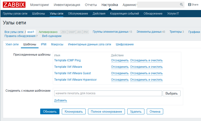 Теперь нужно немного подождать - шаблоны опросят esxi и создадут список виртуальных машин, имеющихся на нём, в которым в свою очередь прикрепят шаблоны для мониторинга их состояния